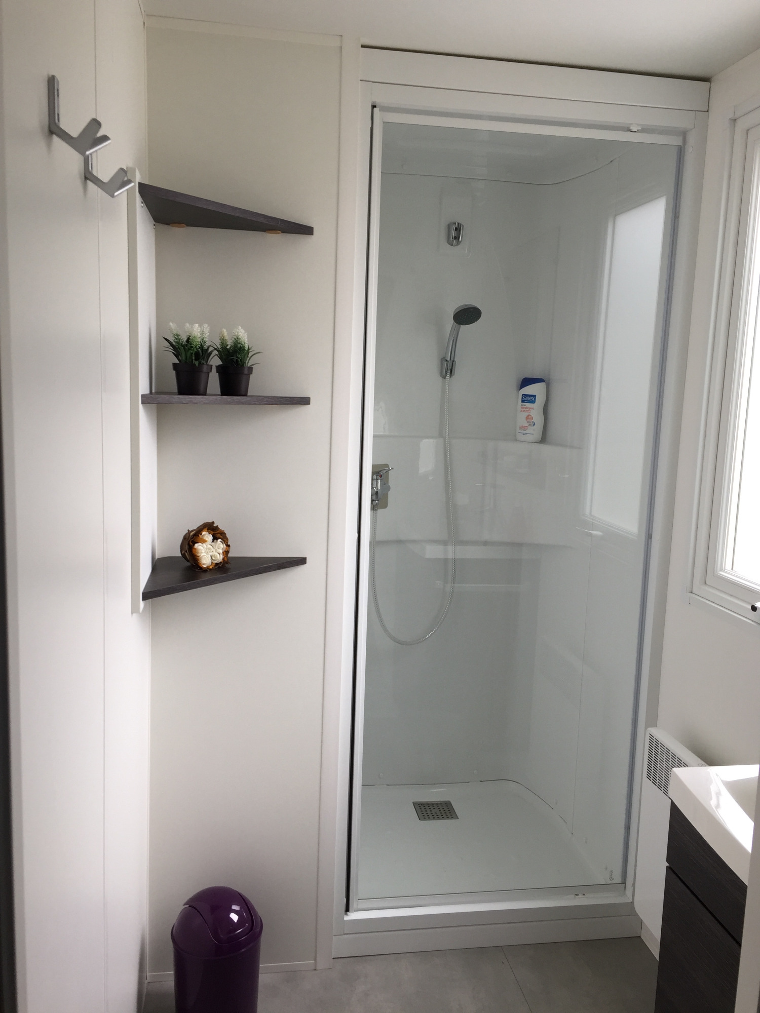 - Une salle de bain avec cabine de douche, lavabo, sèche-cheveux